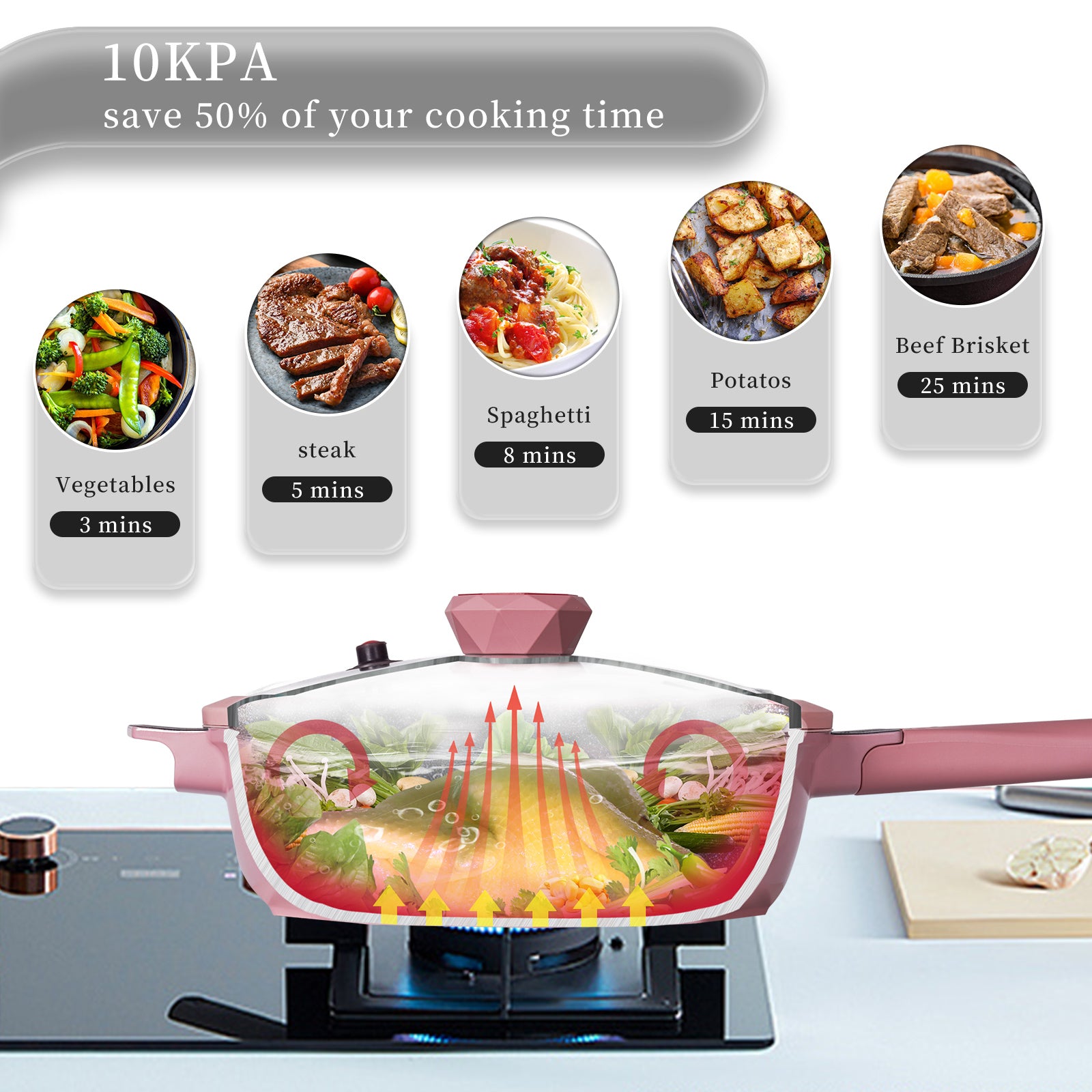 Save Cooking Time: The nonstick deep skillet with lid and comes with a 10 KPA micro pressure valve on the fringe, when your dish require to stew, it will speed up as much as 40%-50% compare to ordinary carbon steel and cast iron frying pan, great for saving cooking time during your busy schedule. The lid can firmly lock the pot body to increase the flavour of food, lock the moisture and increase meat tenderness.